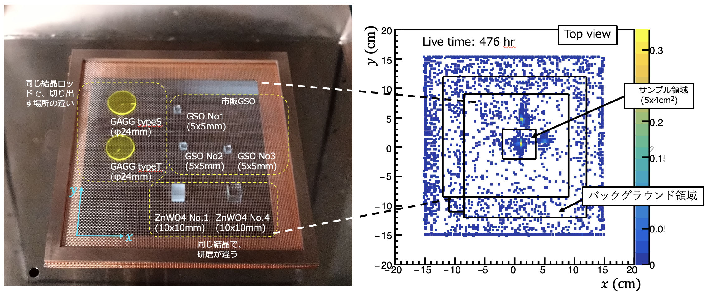 In FY2022, surface alpha-particle analysis was performed on PEN film sheets from the KamLAND experimental group, copper ribbons from the NEWAGE experimental group, and scintillator crystals being developed at the University of Tokyo and Tohoku University (see photo above and resulting contamination image).
